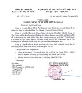 Công ty cổ phần đầu tư đô thị An Hưng xin trân trọng thông báo, Căn hộ chung cư The Charm tại Dự án công trình hỗn hợp văn phòng, thương mại, nhà ở (có kết hợp bãi đỗ xe khu vực), cây xanh, nhà ở thấp tầng, trường mầm non tại ô đất TTDV03 thuộc Khu đô thị mới An Hưng, phường Hà Đông, thành phố Hà Nội đã đủ điều kiện và sẵn sàng bàn giao cho khách hàng mua nhà.